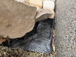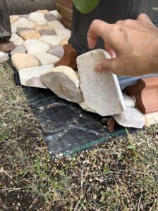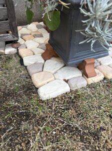 芝の上だった部分に防草シートを敷き、その上にブロック(レンガ)を並べてみました。